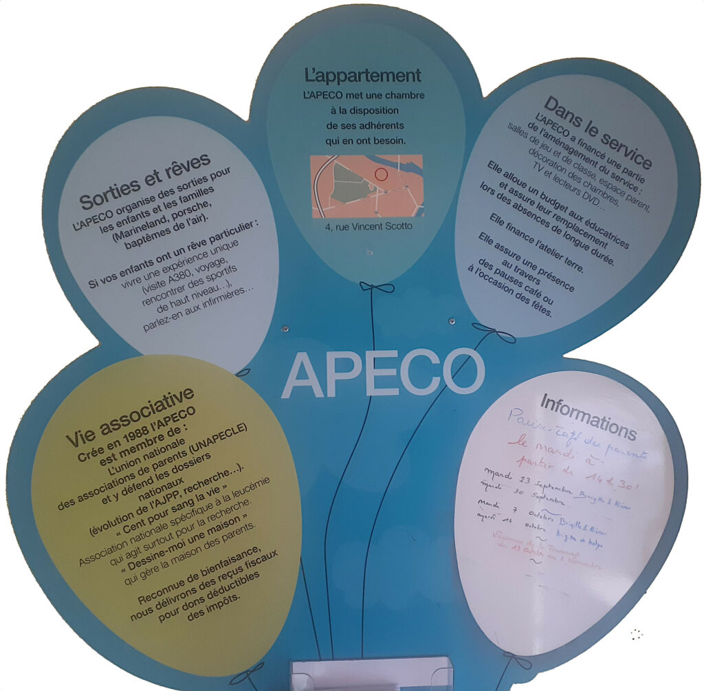 A chaque fois que les bénévoles de l’APECO arrivent dans le service elles sont bien accueillies, tant par les parents que par le personnel médical, les éducatrices et les institutrices. L’APECO est la seule association organisant ces moments privilégiés d’échanges avec les parents autour d’un café, d’un thé ou d’une boisson au sein du service.